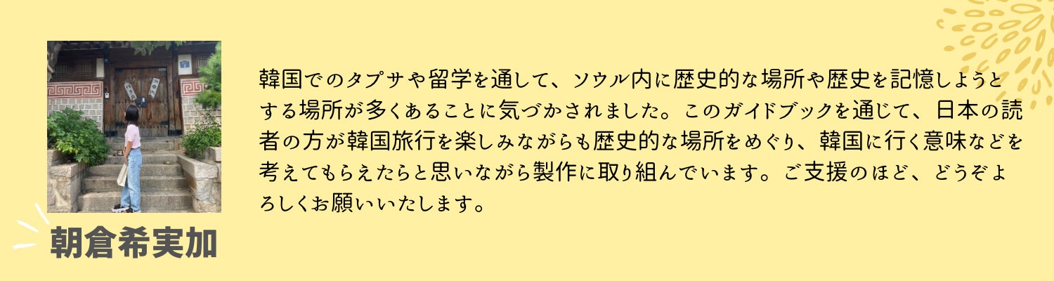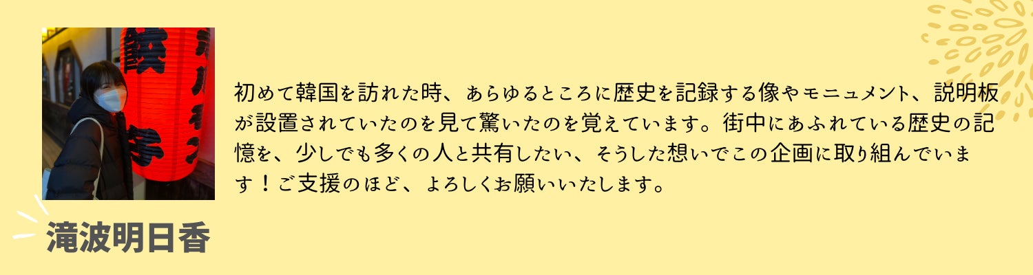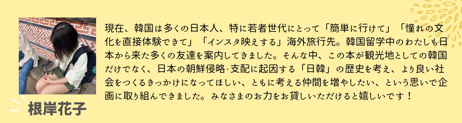 もちろんKカルチャーに興味・関心を持つことは良いことですが、歴史問題を無視して「楽しい」側面だけを見ても、本当の意味での「友好関係」を築くことはできません。こうした風潮を変えるべく、わたしたちはガイドブックをきっかけに、少しでも多くの人に「日韓」の歴史問題に興味を持ってもらいたいと思っています。ご支援、よろしくお願いいたします!
