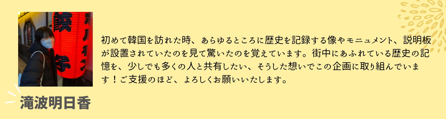 わたしたちはこのプロジェクトを通して、「日韓」の歴史問題に関心を持ち、向き合おうとする仲間を1人でも多く増やしたいと考えています。