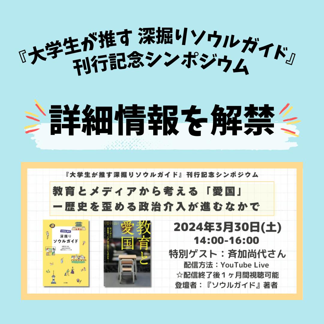 みなさん、こんばんは!わたしたちのプロジェクトの活動報告をご覧いただき、ありがとうございます。先日も少しお伝えしました『大学生が推す深掘りソウルガイド』刊行記念シンポジウムの詳細が決まりましたので、告知させていただきます。