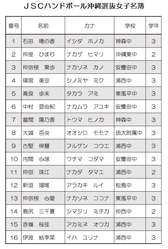 私たちは沖縄県内の中学校女子ハンドボール部より選抜された8校16名のメンバーです。