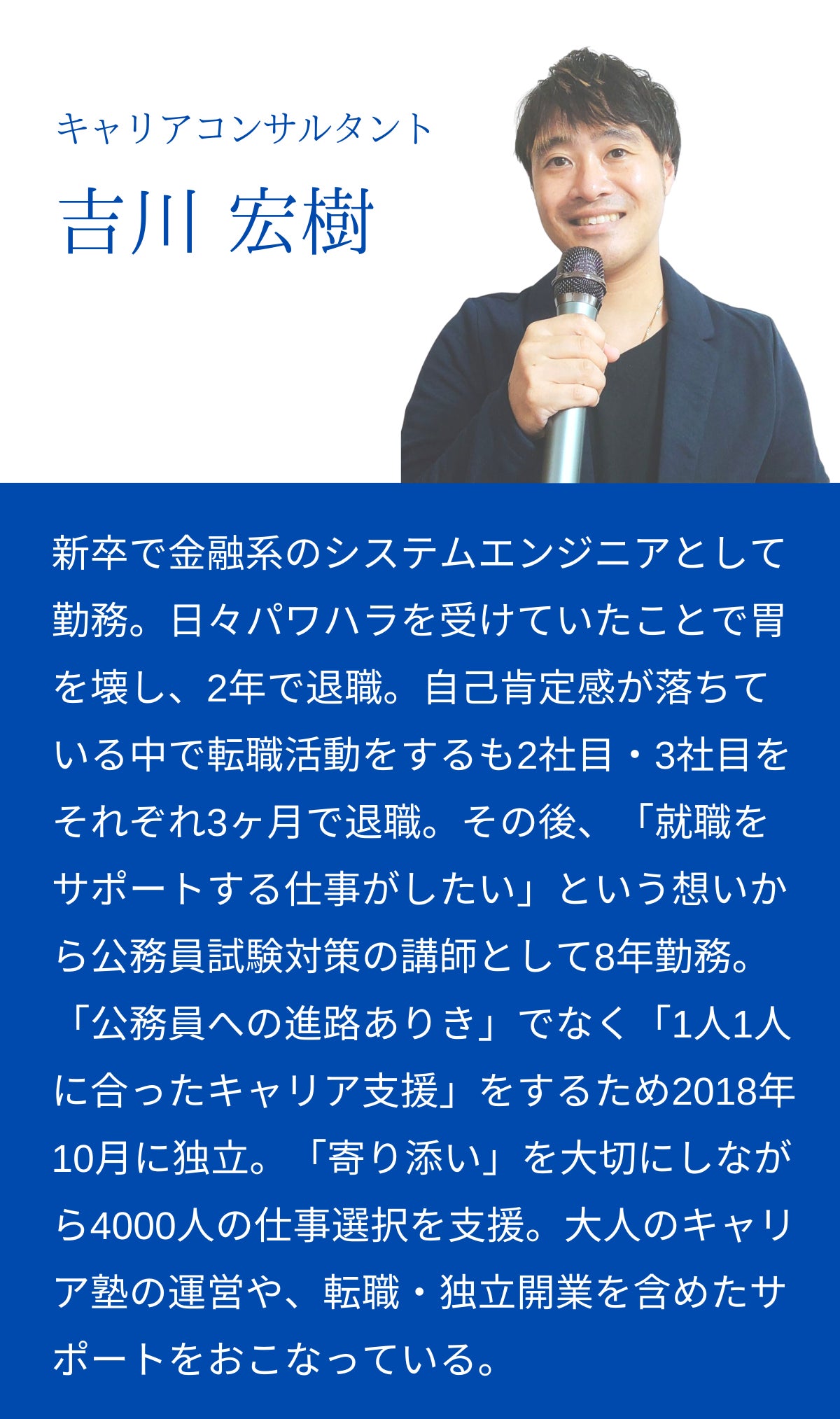 はじめまして!転職・独立開業を含むキャリア支援をおこなっている、キャリアコンサルタントの吉川と申します。