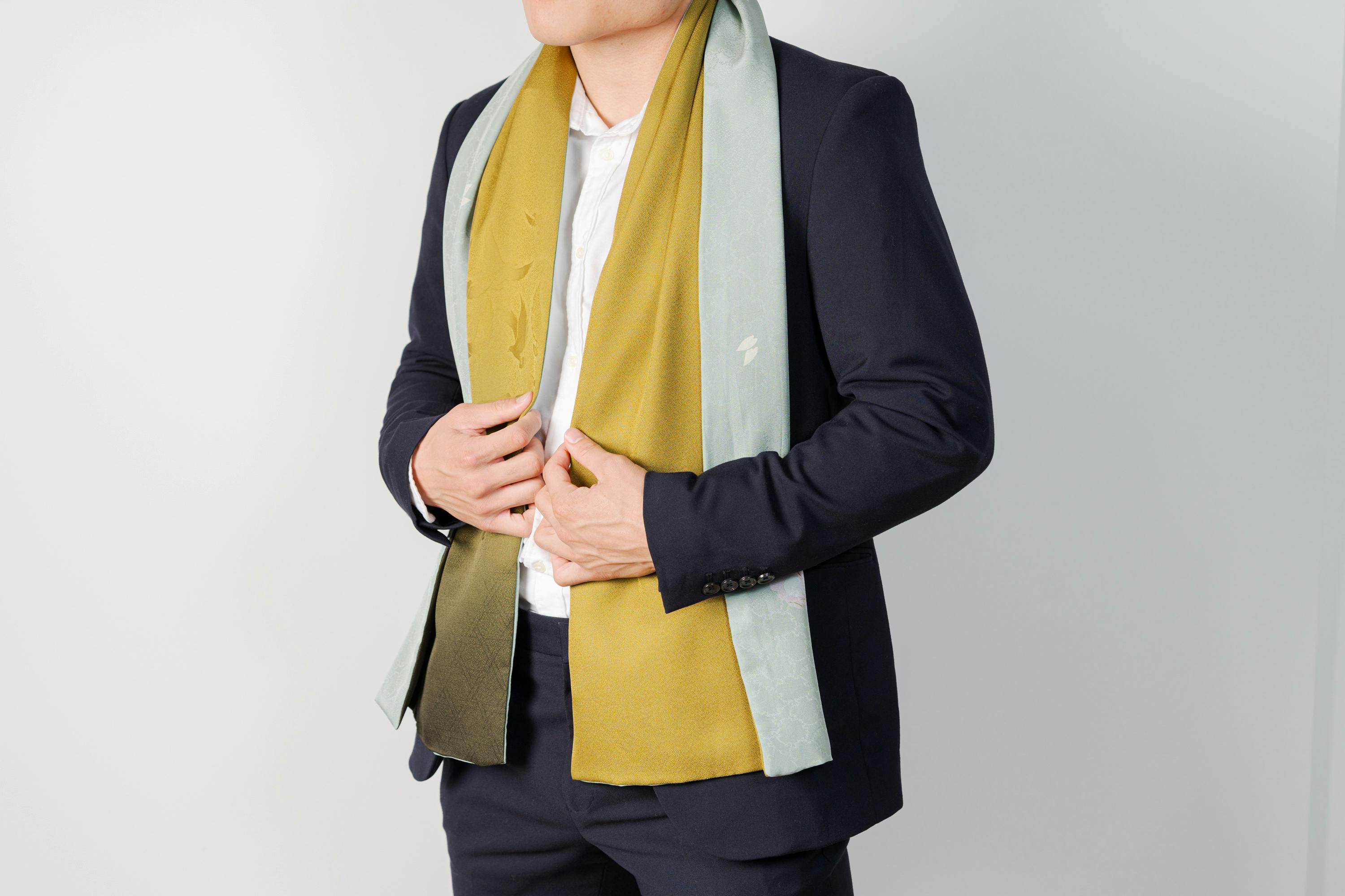 ひとつの着物からは最大で4本のマフラーが作れますが、使う箇所によって柄が微妙に変わるので、二つとして同じマフラーは存在しません。正真正銘の一点ものです。