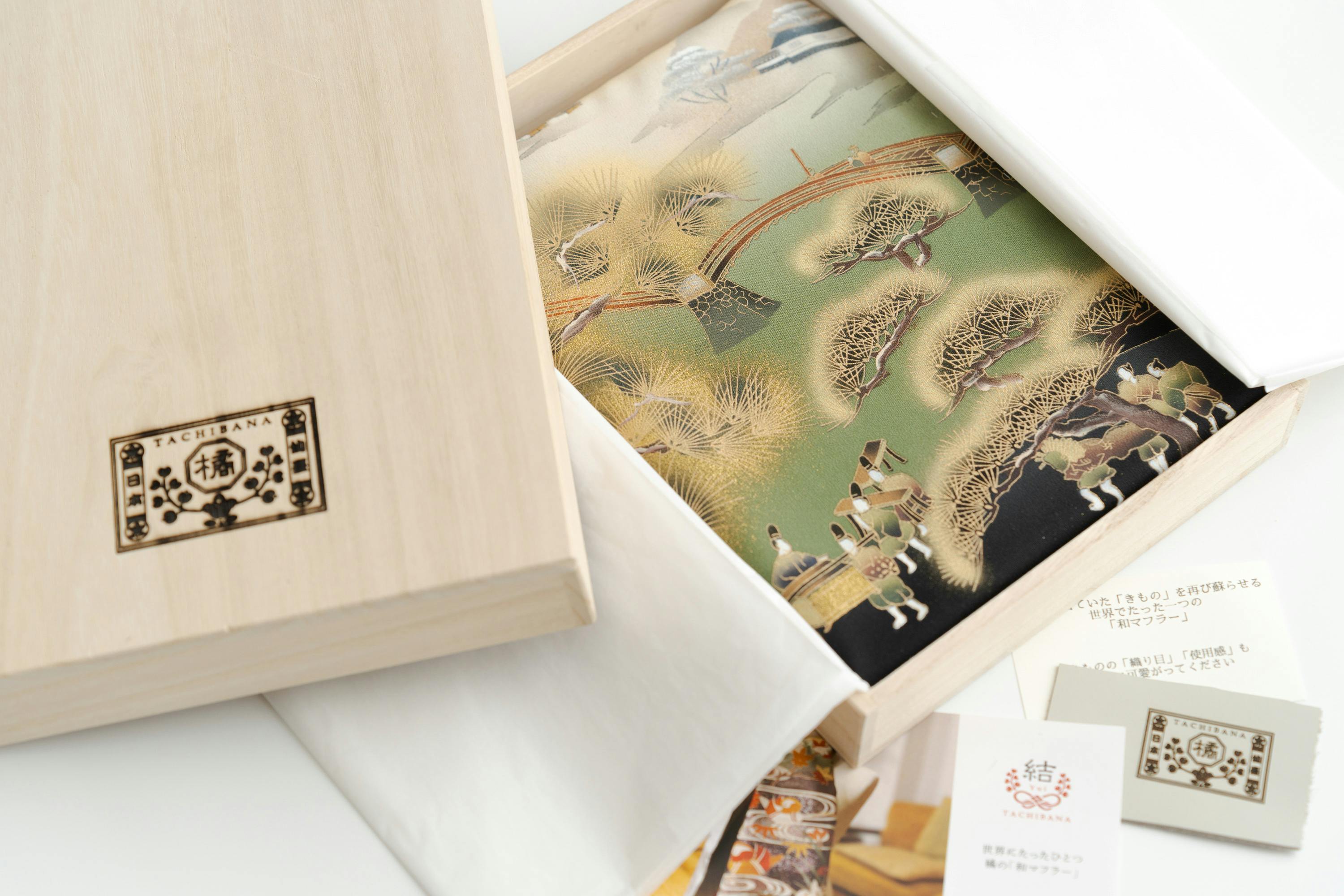 亡きご家族の着物をマフラーにして受け継ぎたいというご要望をきっかけとして、始めたサービスです。ひとつの着物から4本のマフラーが作れるので、ご家族の方々と思い出の品を分かち合うことができます。