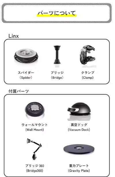 「クランプ」「真空ドッグ」「ウォールマウント」「重力プレー ト」が、がっちりと、根元を固定し、ぐらつかせない。