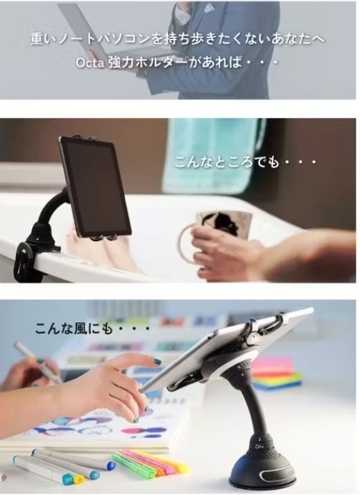 Octaのタブレットホルダーをご紹介します家の中だけでなく出先でも、サッ!とグッズを取り出し素早くセット!