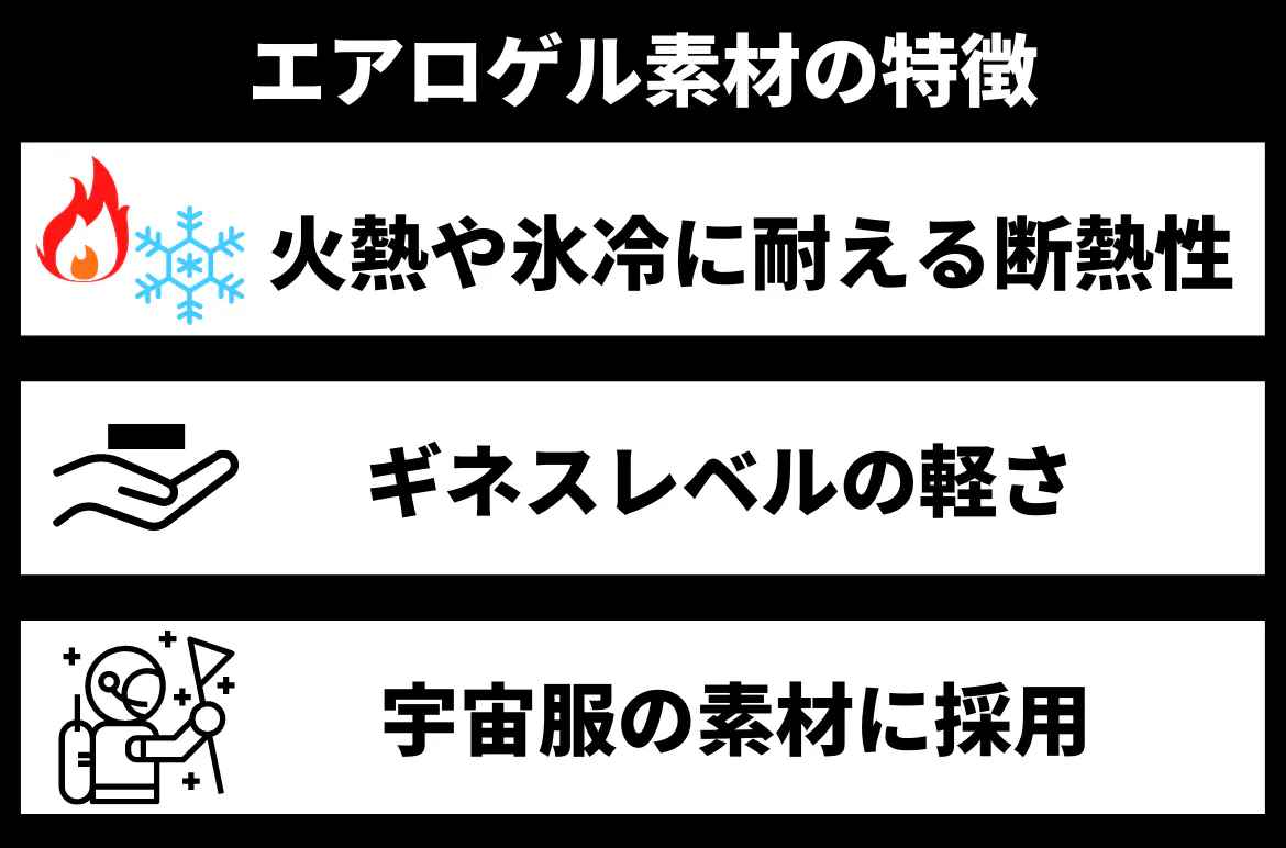 1.宇宙服素材エアロゲル採用!超断熱・超防寒を可能に!