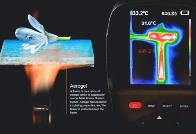 エアロゲルは「断熱性」にとても優れた素材です。こちらの実験では、下からの炎にエアロゲル素材を挟むことで、熱を遮断している様子が確認できます。炎は649.2℃まで上昇していますが、エアロゲルの上に乗っている花は室温とほぼ同じ31℃。温度変化はありません。
