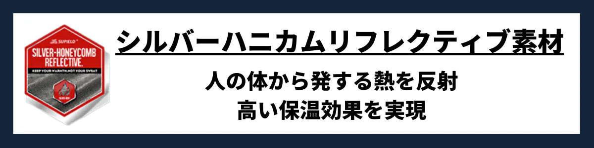 保温性を保つために、ジャケットの内側にはシルバーハニカム・リフレクティブ(SILVER-HONEYCOMB REFLECTIVE)」素材を使用。人の体から反射する赤外線熱を反射して、熱をそのまま保存してくれます。