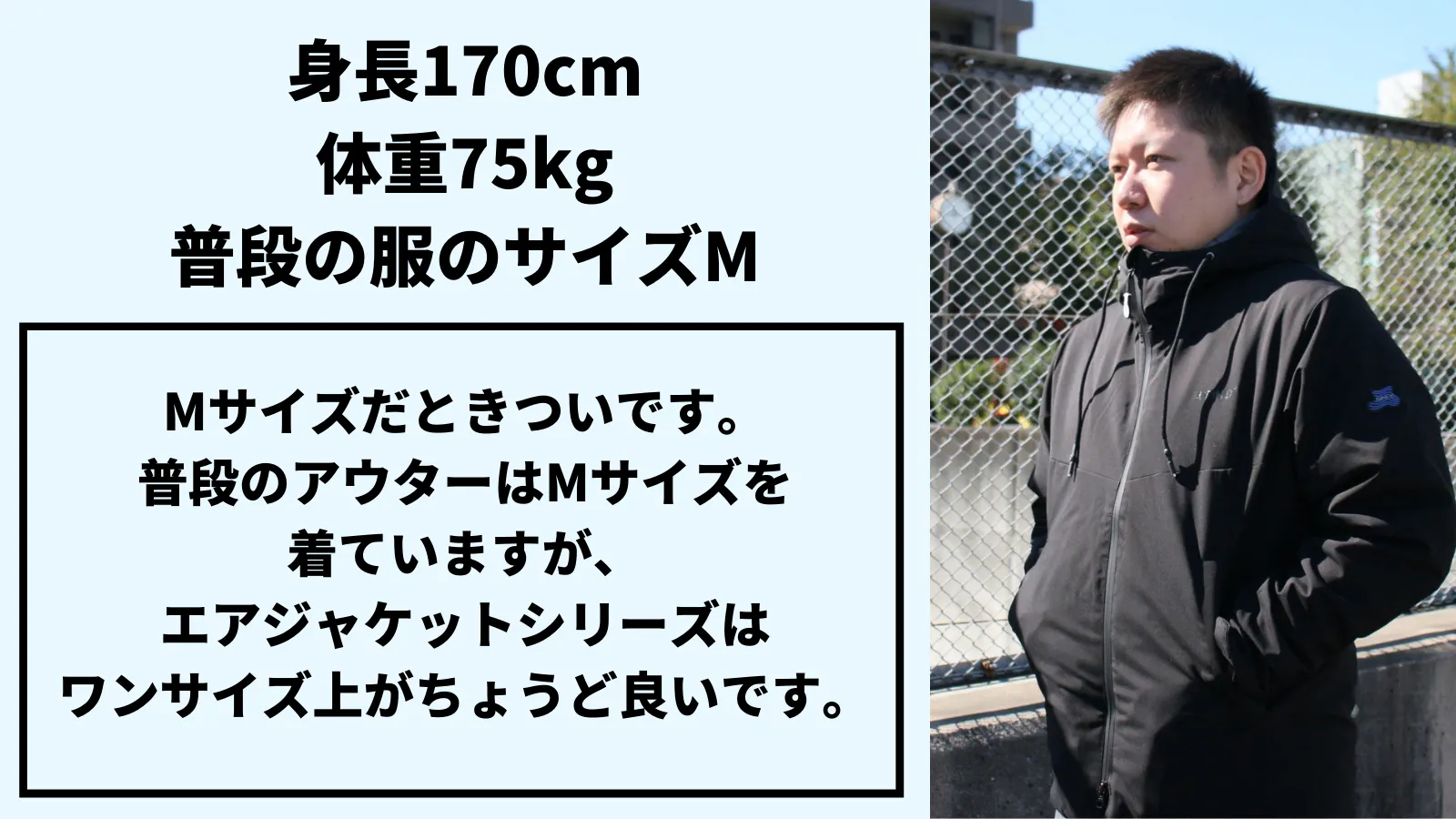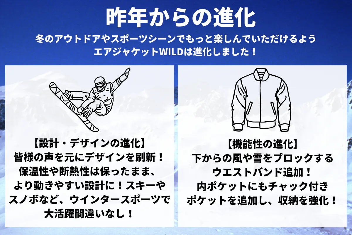 エアジャケット WILDは、断熱性や撥水性の機能面だけでなく、着心地の良さも計算された設計となっています。