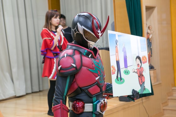 破牙神ライザー龍の防犯教室は、「防犯標語」を暗記するのではなく、イラストパネルを使って、子供たちに視覚的に身の危険を感じてもらいます。