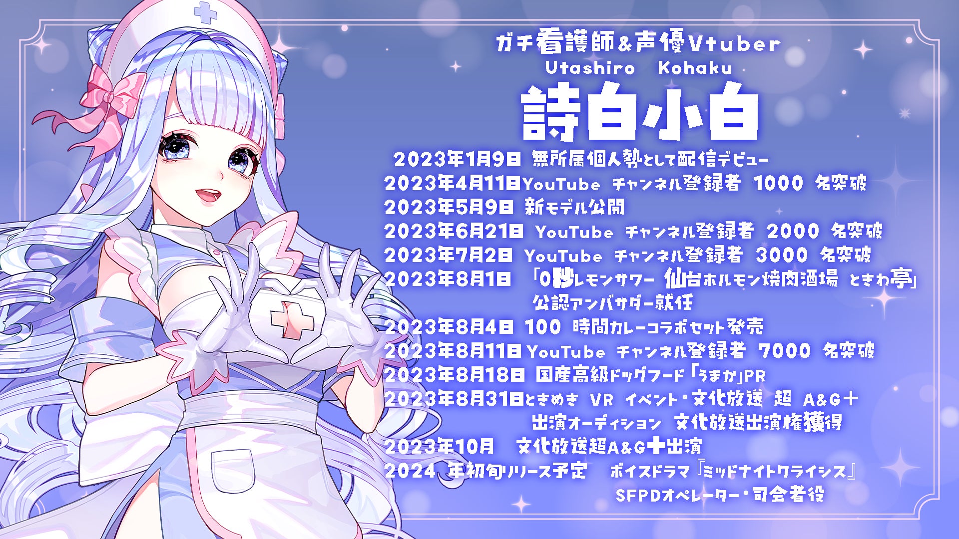 詩白小白は2023年1月にデビューしたガチ看護師兼プロ声優Vtuberです。