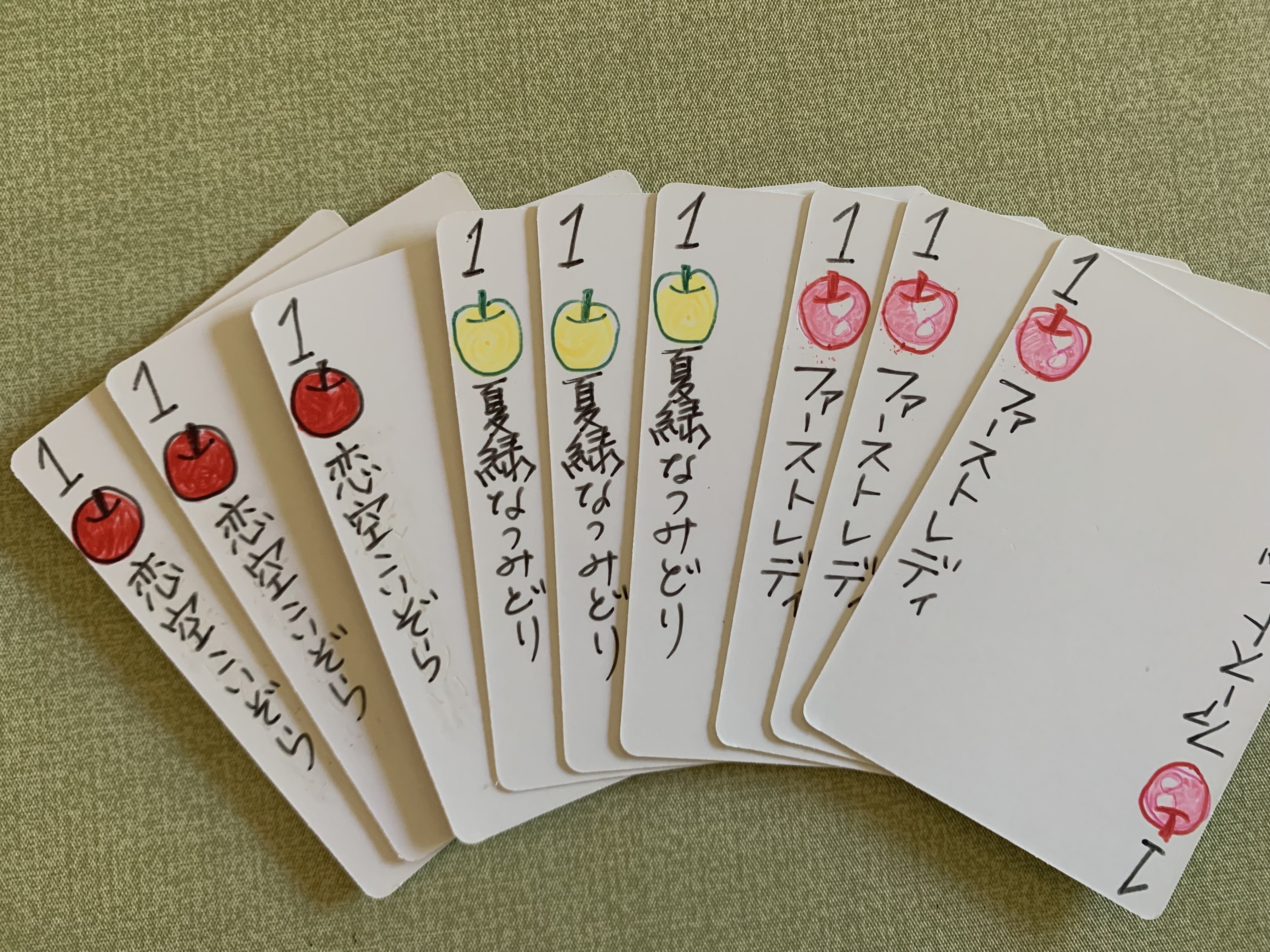 私が開発するあっぷるぱい(牌)が本当に面白いのか検証するために、最初は無地のカードに手書きで描いた手作りのセットを作りました。