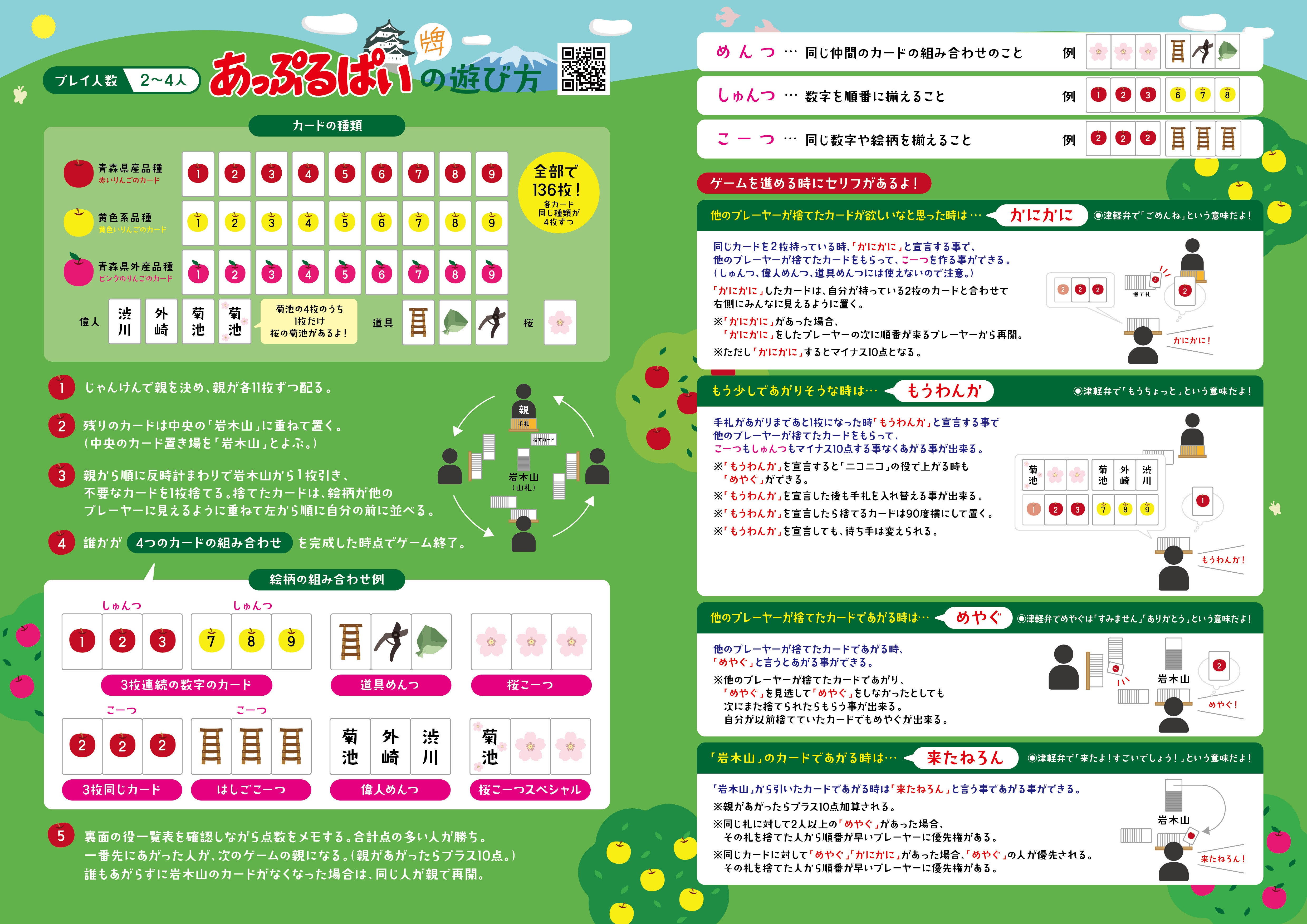 麻雀とドンジャラの中間くらいの難易度に設定。麻雀牌と同じ枚数で沢山のりんごが出てくるから名前は「あっぷるぱい(牌)」。冒頭に遊び方の動画を入れましたのでご覧ください。ルールにはいくつかの津軽弁がでてくるのも特徴です。
