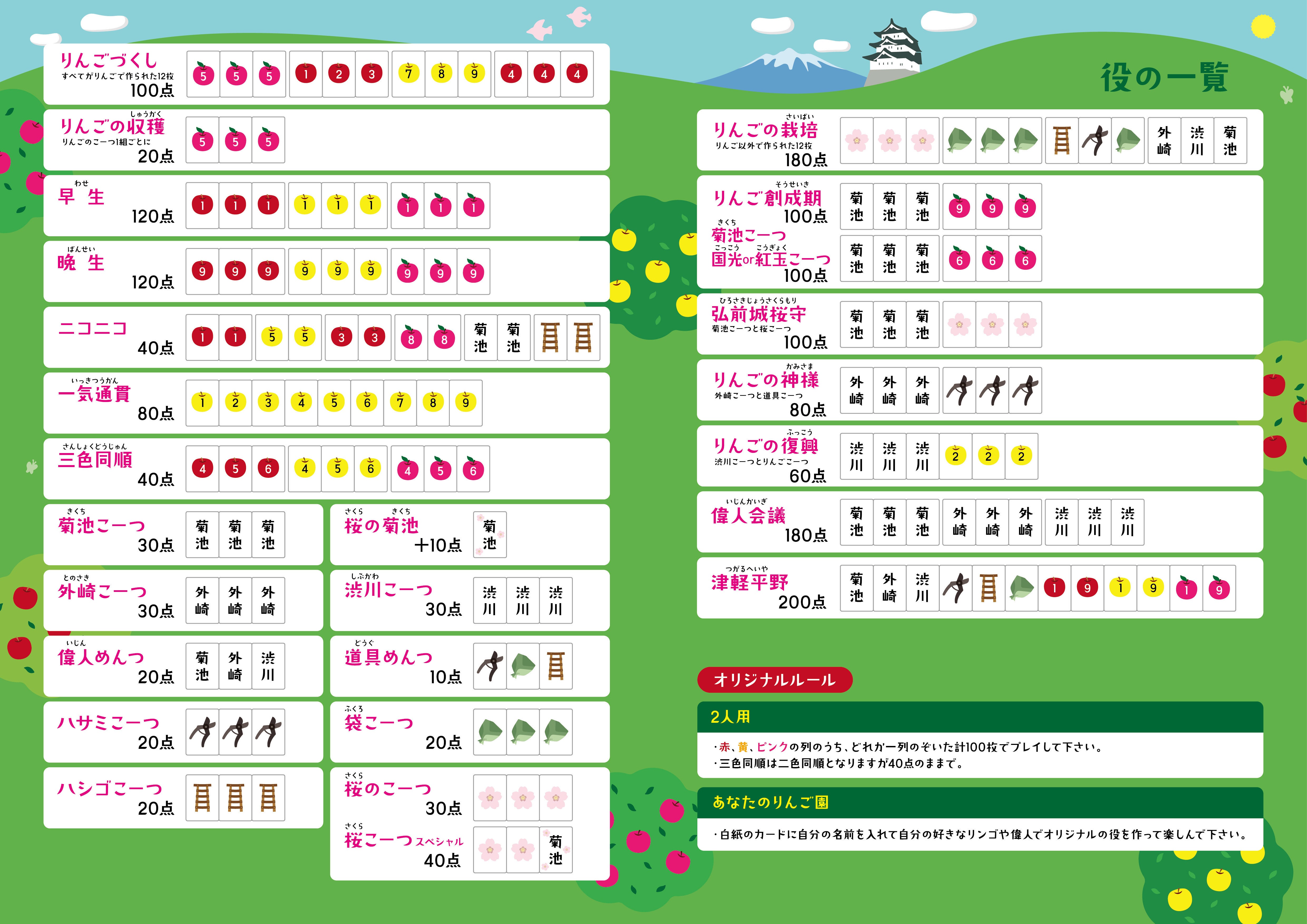 このセットには白紙のカードが8枚入っています。使い方として、皆さんの好きな役を作ってみるのはいかがでしょうか?例えば木浪家の畑にある「りんご」と「木浪」のカードで100点とかいう風にオリジナルのローカルルールで楽しめます。
