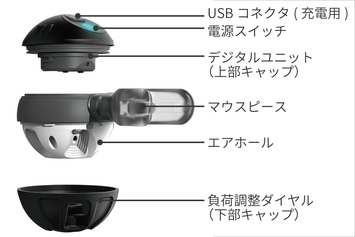 A. 状況や場所によって上部のパーツを一般パーツか電子パーツから選んでいただき、マウスピースを口に入れて大きく鼻から吸って口からはいてを繰り返してください。