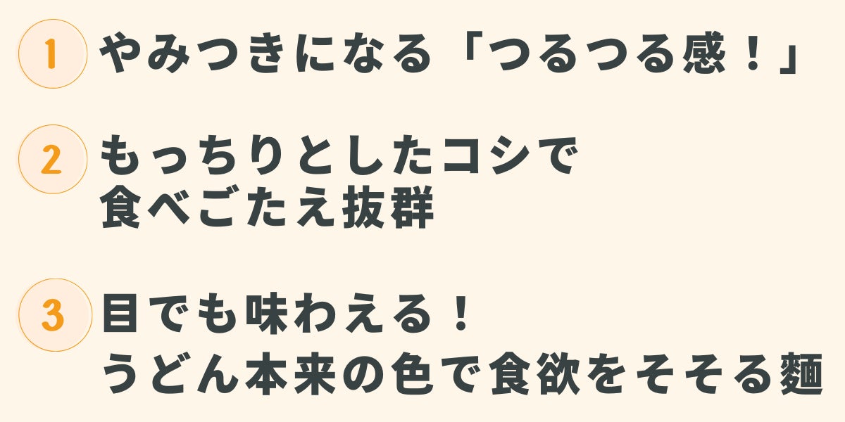 3年の年月を費やし完成させた「贅沢なおうどん」。そのおいしさの特長は、次の3つです。