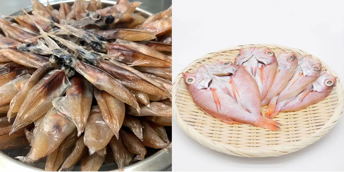 IMATOでは、富山湾で水揚げされた魚をメインにイカ・タコ・貝などの魚貝類を、一度も冷凍しないまま刺身でも食べれる鮮度のうちに干物に加工しています。