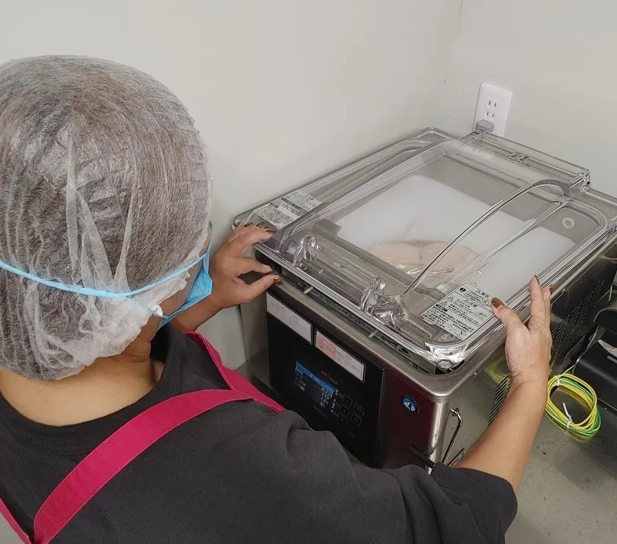 提携している梅干し製造工場からもらい受けた未利用資源である梅酢と、砂糖を配合して作った調味液と、下処理を済ませた魚を袋に入れ、真空包装をします。
