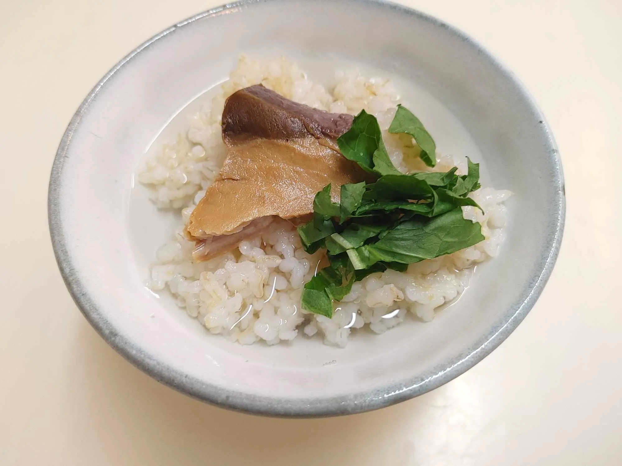 ご飯一膳に梅魚Ⓡぶりを一切れのせ、梅魚Ⓡの漬け汁小さじ2を加えます。漬け汁の量はお好みで調整してください!(塩分濃いので注意) 大根の葉(お好みの具)を少々のせ、お湯200ccを注いで出来上がり!