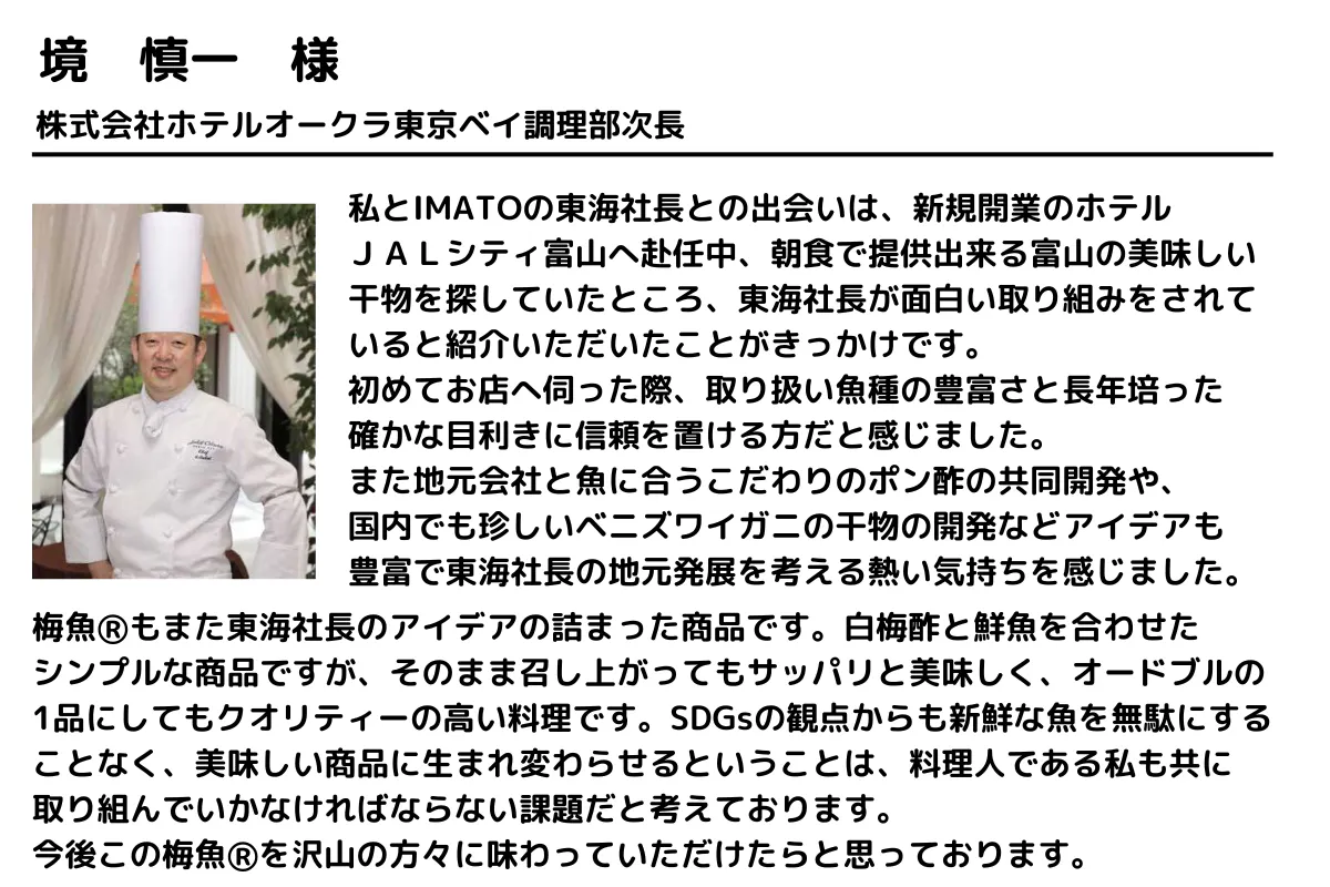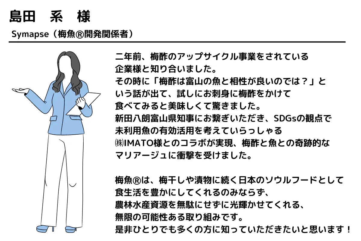 私は、長年射水市に暮らし、富山県の恵みの恩恵を受けてきました。その恩を少しでも返そうと、地域の発展に貢献したいと思っています。梅魚Ⓡを全国、世界に広げていくことはその一つの手段になると考えています。