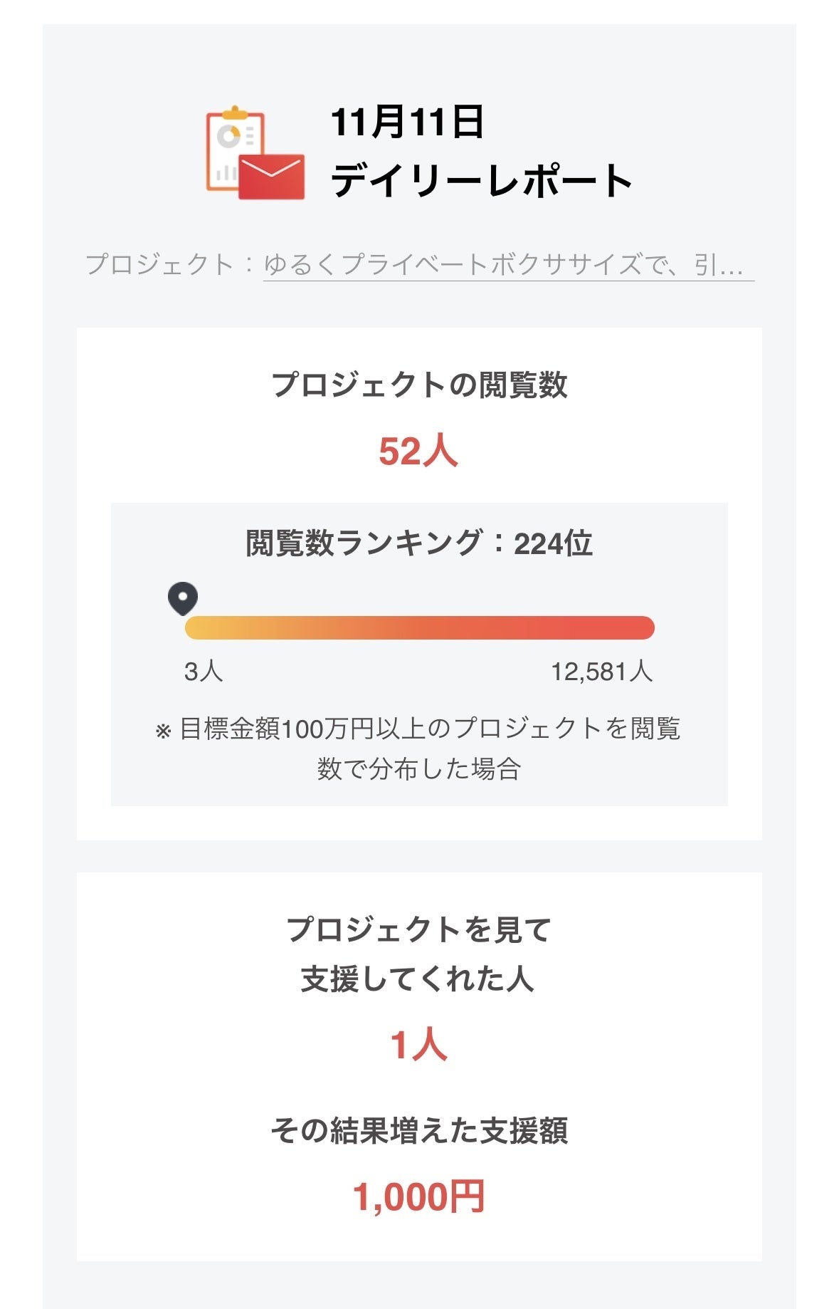 少しづつですが、多くの方にプロジェクトを閲覧、支援していただけるようになっております。