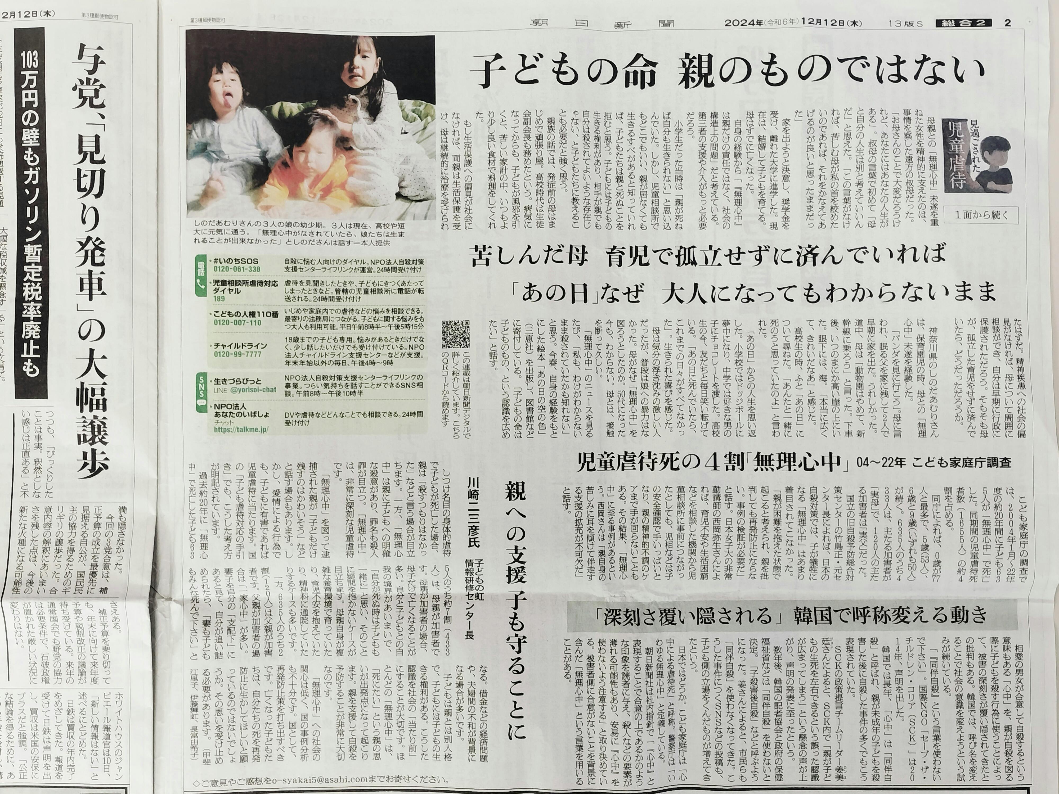 また、前回の活動報告で、朝日新聞デジタルへの記事掲載についてお知らせしましたが、その後12月12日付の朝日新聞朝刊1~2面にも特集のまとめ記事が掲載されました。