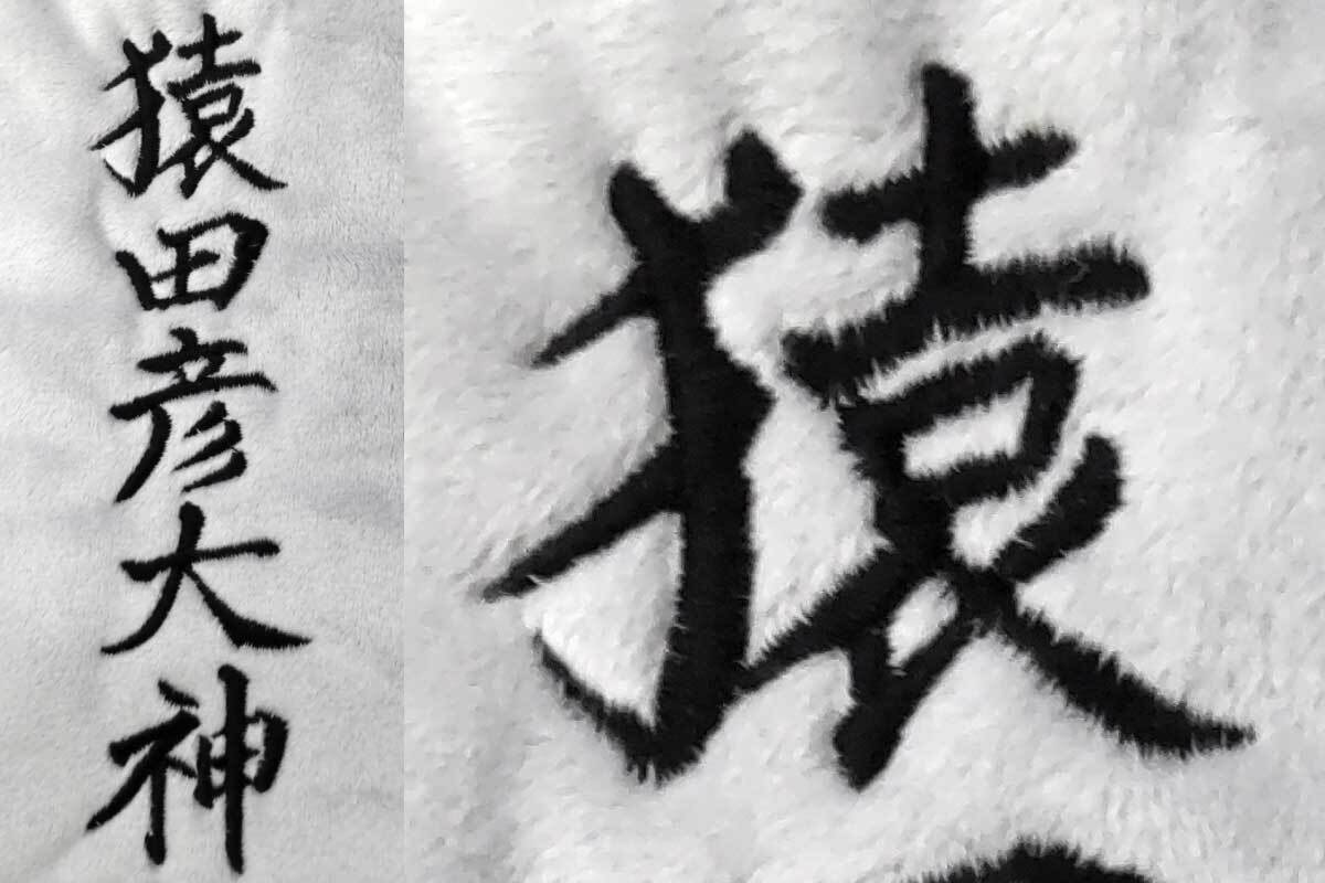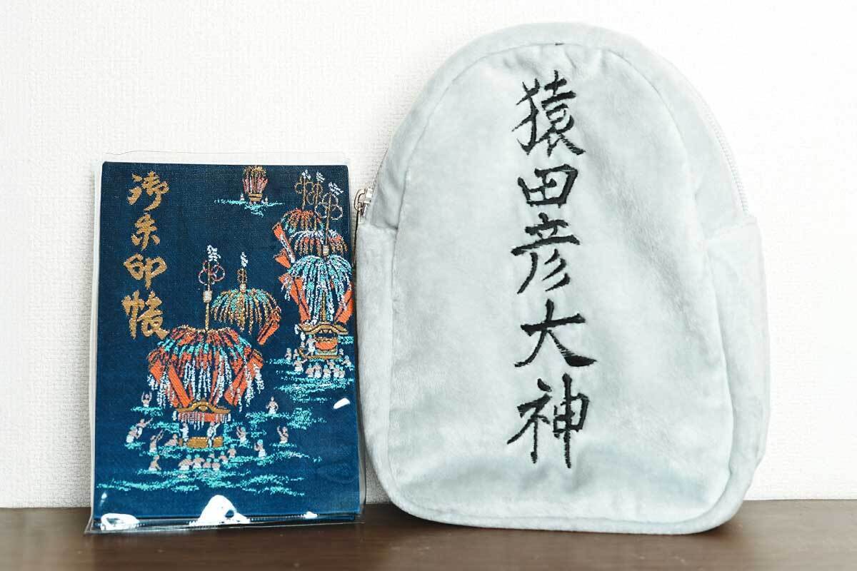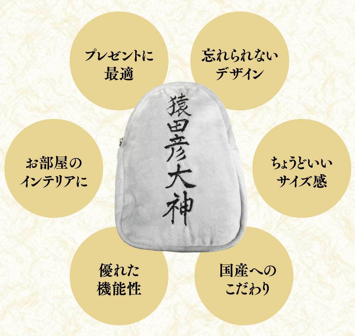 猿田彦大神の石碑のイメージをデザインに取り入れたもので、石を模したグレーのボディに黒い刺繍で描かれた『猿田彦大神』の文字が見る人に強い印象を与えます。