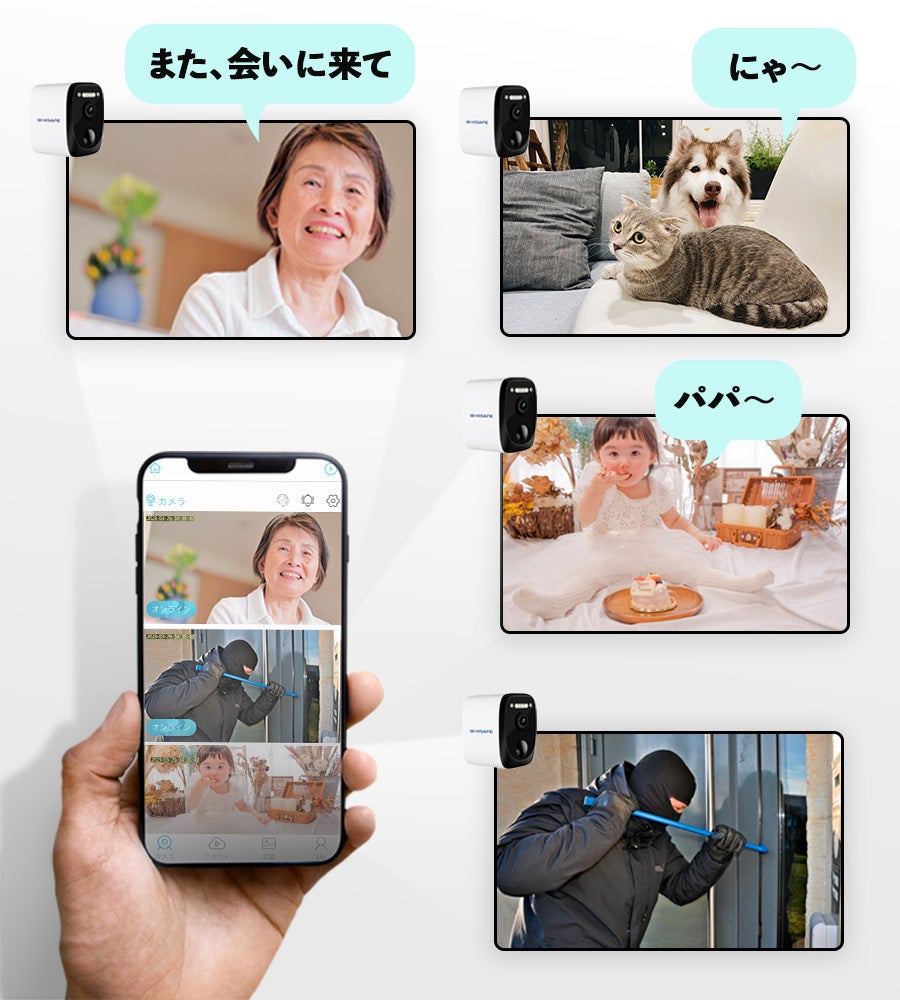 玄関、ガレージ、駐車場、離れの監視、赤ちゃんやペットの見守り等、様々な用途に使用可能です。