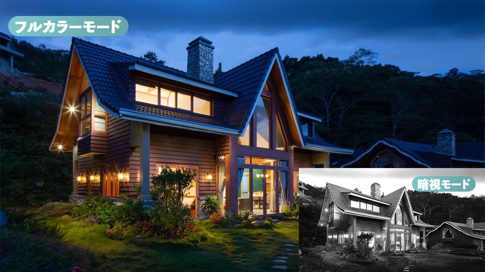 暗闇をカラーで映す、フルカラーモードで特に防犯や安全が気になる暗闇でもカメラ機能を発揮します。
