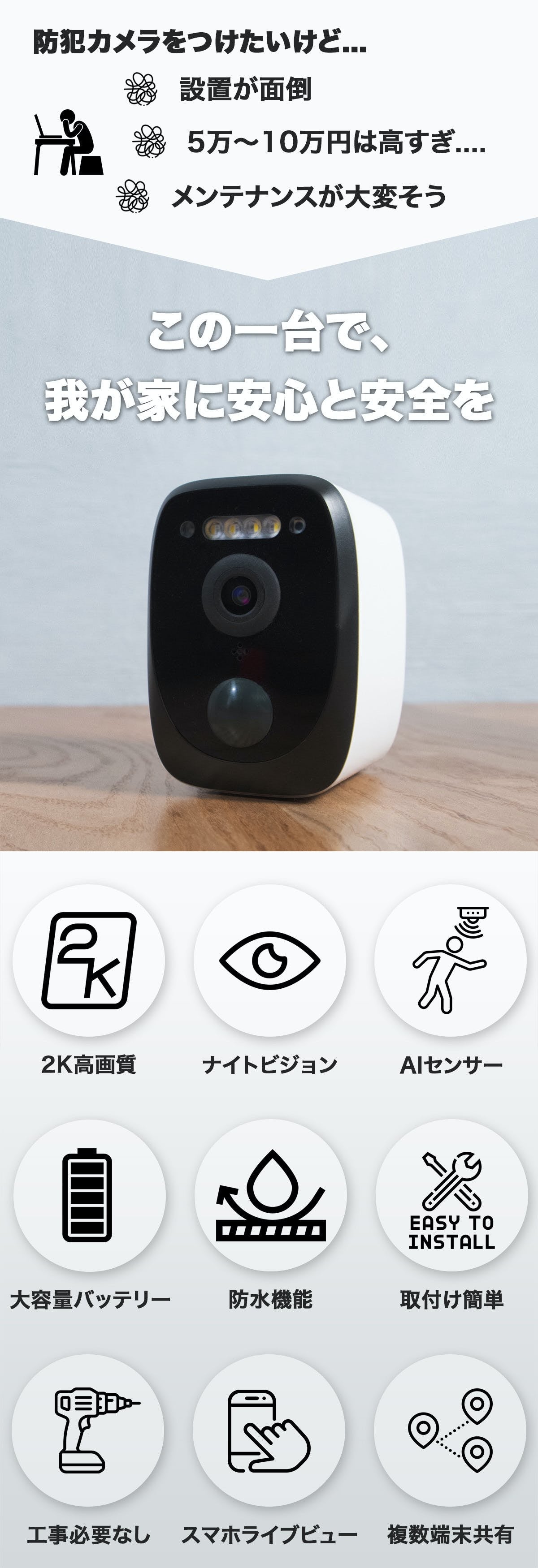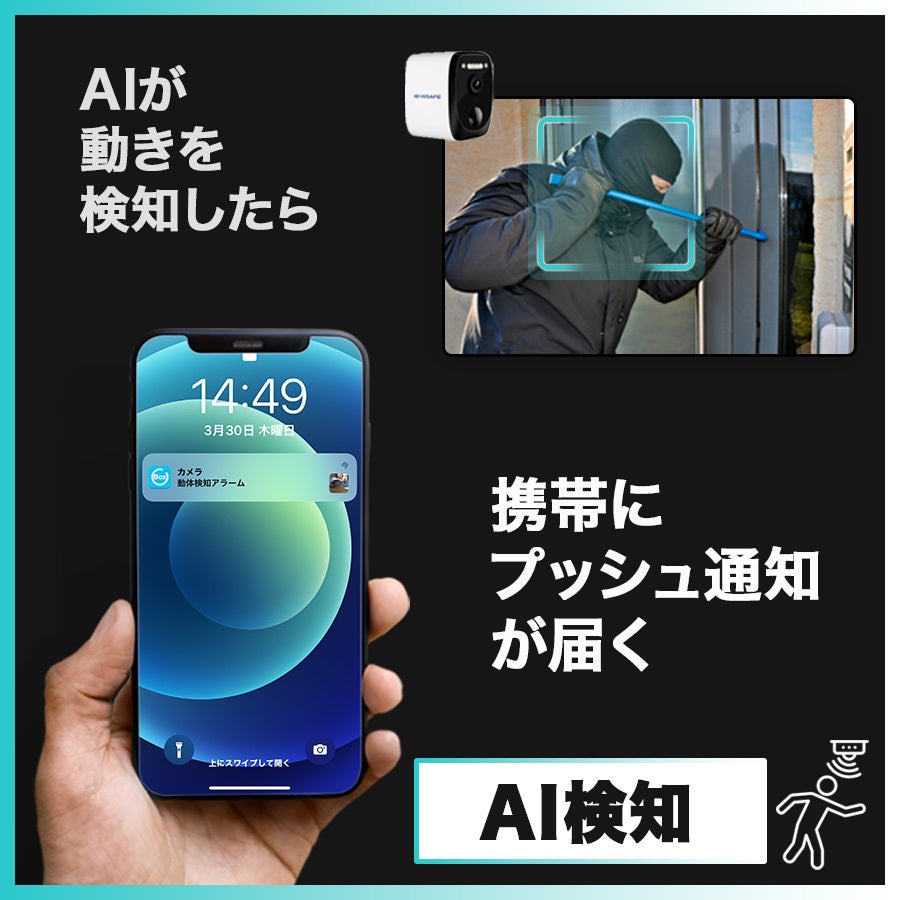 AI検知、2K超高画質映像、フルカラー暗視、防塵耐性IP67と防水性に加え、遠く離れたご家族とご自宅をスマホ一台で守れる複数端末共有機能をこの1台で実現。