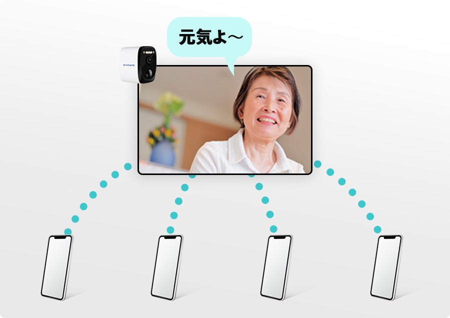一台のカメラが写した映像を複数の端末で同時視聴ができます。みんなで見守ることで、遠くにお住まいのご両親の異変に気づいたり、旅行中にペット様子を皆さんで確認することができます。