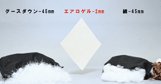 エアロゲルは断熱性と軽量で動きやすさに優れ、宇宙で-170~+110℃の過酷な環境下で宇宙服等に使用されている素材です。魅力的な素材ですが、開発コストが高く、一般に普及するのは難しいとされていました。