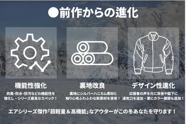 「エアジャケット2」は、従来のエアロゲルジャケットからグレードアップし、スマートヒーター機能が搭載されただけでなく、「機能性」「デザイン性」「カラー展開」すべてが進化しました!