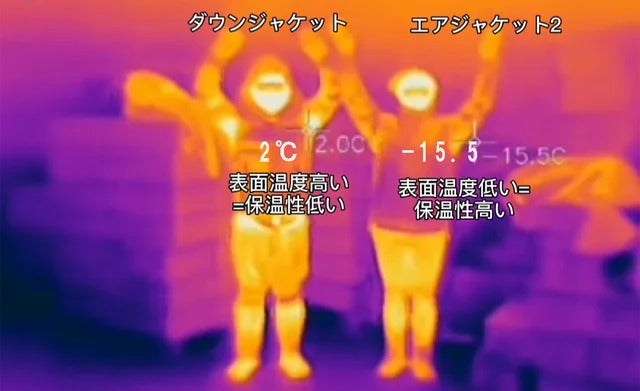※一般的なダウンジャケットの表面温度が高いのは、熱が外側に放散しているからです。しかし、弊社のエアロゲルジャケットは、上記実験の通り、エアロゲルの断熱性とシルバーハニカム・リフレクティブ(SILVER-HONEYCOMB REFLECTIVE)」素材の熱反射を活用して熱を内側に閉じ込めているため、持続的に保温することが可能となっています。このことから、エアロゲルジャケットが高い保温性を有していることが確認できます。