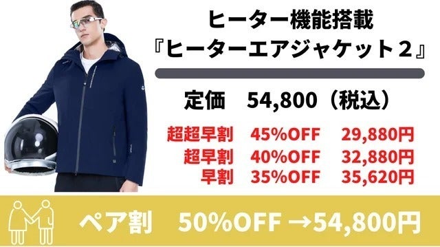 前作に引き続きヒーター付きジャケットも用意しておりますが、ヒーター機能搭載していないシリーズも、求めやすい価格で用意しております。さらに今回はカラー展開、デザインや機能性もバージョンアップしたため、利用シーンに合わせてお選びいただけます。