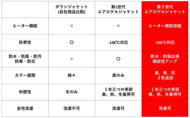 「エアジャケット2」は、従来のエアロゲルジャケットからグレードアップし、スマートヒーター機能が搭載されただけでなく、「機能性」「デザイン性」「カラー展開」すべてが進化しました!