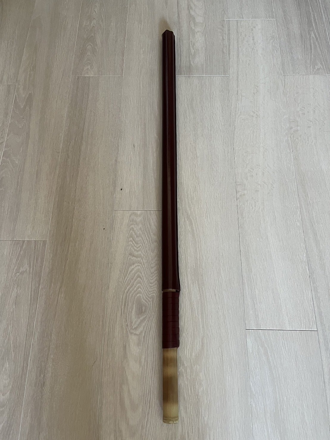 ①蟇肌竹刀(皮で加工を施された、ケガをしにくい竹刀。)をリターン。ロシア人職人”イーゴリさん”お手製。制作に現在1か月お時間をいただいておりますが、新陰流兵法碧燕会名古屋支部で稽古用のものをご用意いたします。入会次第、蟇肌竹刀での稽古は可能。