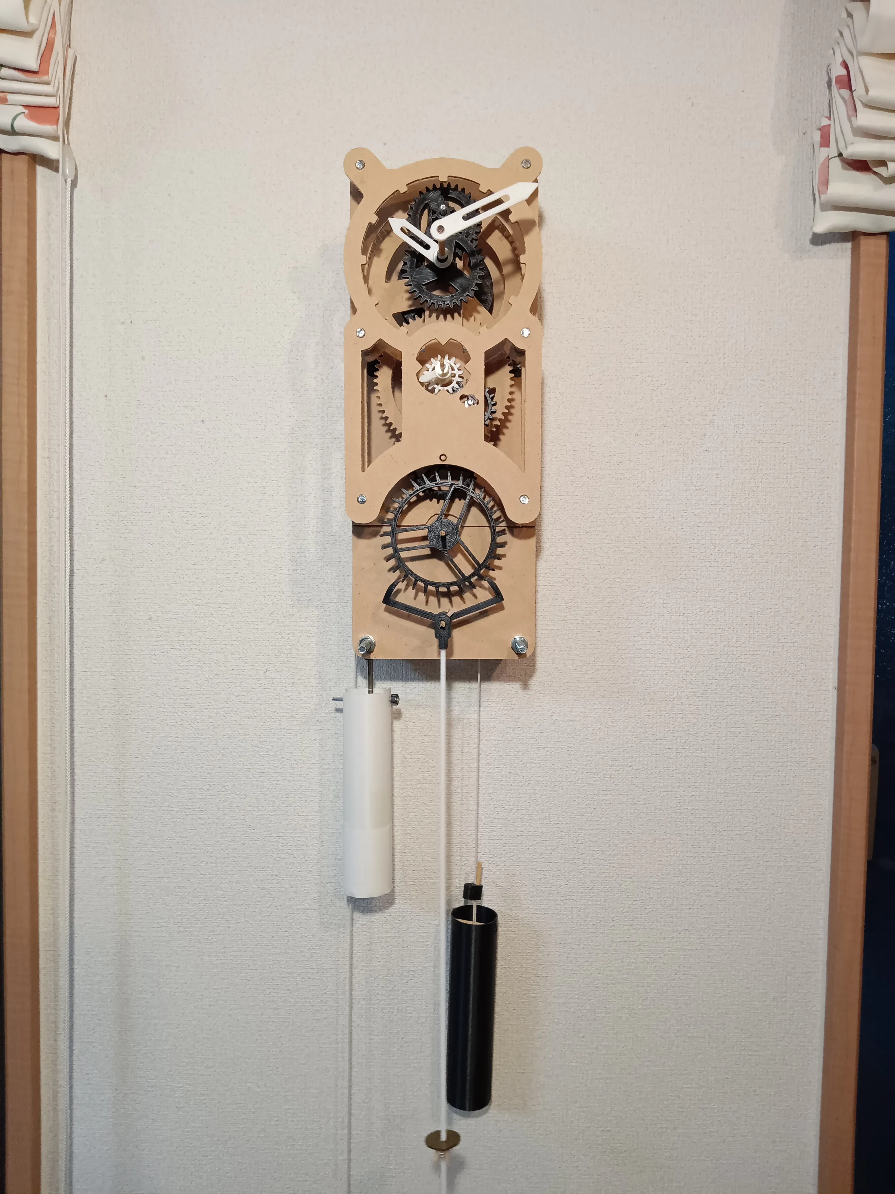 時計の原点に立ち返ってガリレオが考案した重力で動き振り子で時を刻む「重錘式振り子時計」です。歯車とネジとボルト、そして躯体が全てです。現代の新開発でも何でもない、既存技術の塊です。とはいえ、正真正銘の重錘式振り子時計の市販は珍しく、自作はかなりハードルも高いかと思います。当製品は、設計も部品もハンドメイド≒3Dプリントや材木切り出しですが、二年に亘る研究の成果で部品の精度も向上しており、組み立ては対面講座方式ですので比較的カンタンです。ただし、連続稼働させるには根気と情熱が必要です。僅か200~400gの錘で動いているので、少しのストレスでピタッ!と止まります。スマホのタップで何でも解決する現代生活を基準にして取り組むとすると、かなり面倒な代物です。その点を理解したうえで、動く原理はニュートン力学の基礎なので理科の教材として楽しい学習にも使えます。さらに部品を自ら組み立て、錘の重さで回転する歯車を目で見てカチコチを耳で聞くと、五感で重力を体感頂けると思います。※個人的な意見です。