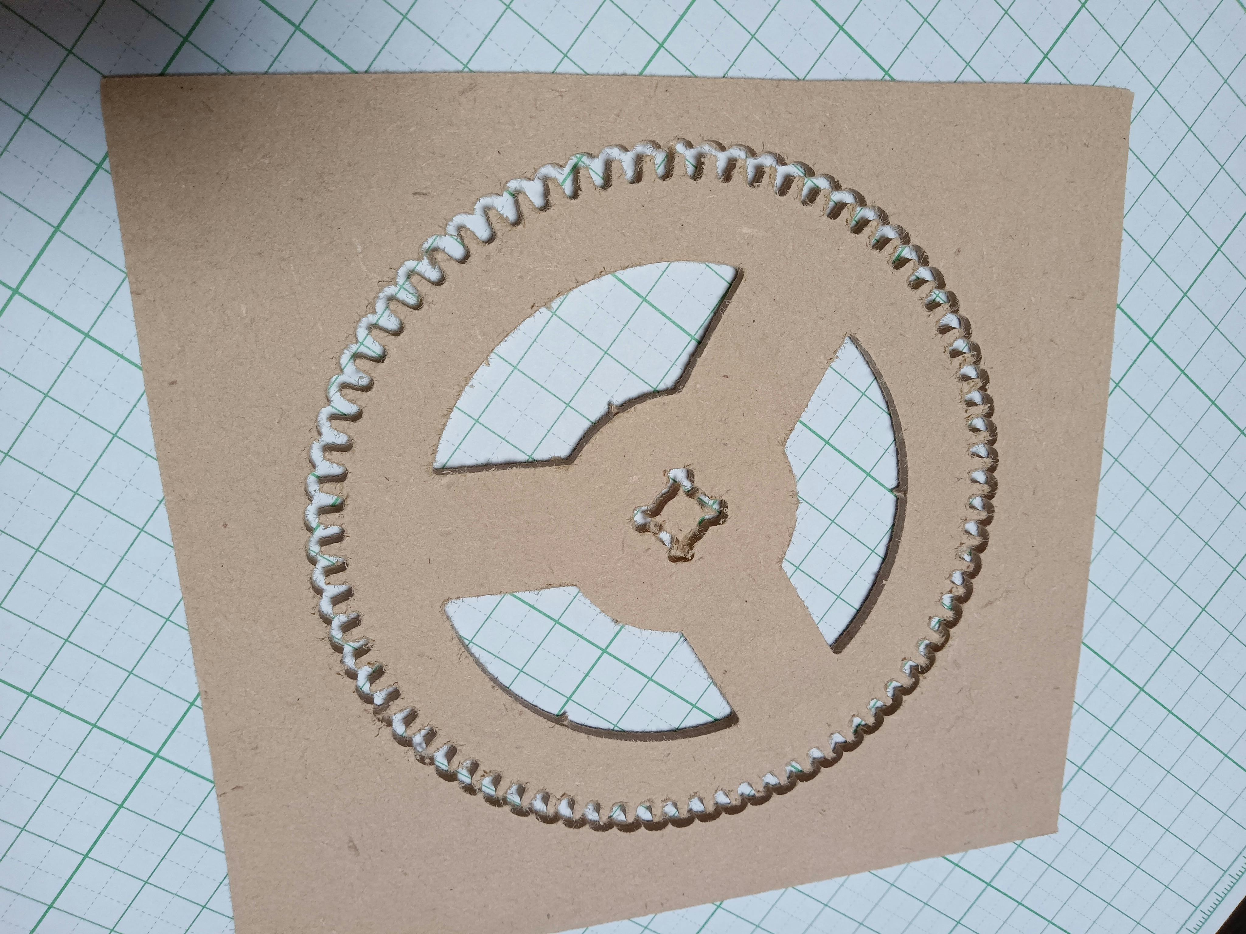 本日の写真は、CNCでMDF(木材)を材料に作った歯車です。