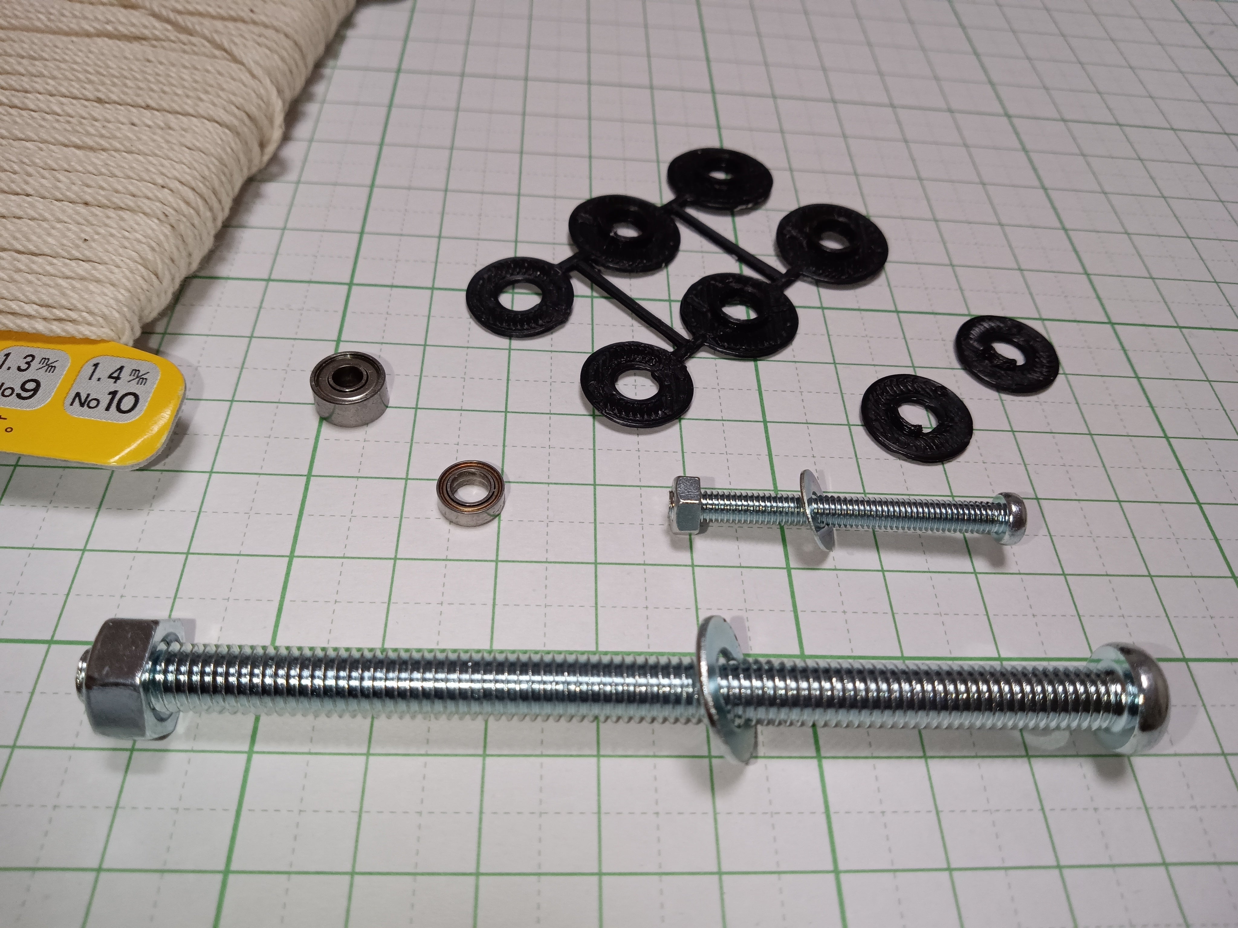 ベアリング2種類、大小の躯体固定用ボルト、左上は重錘吊り用の純綿水糸です。