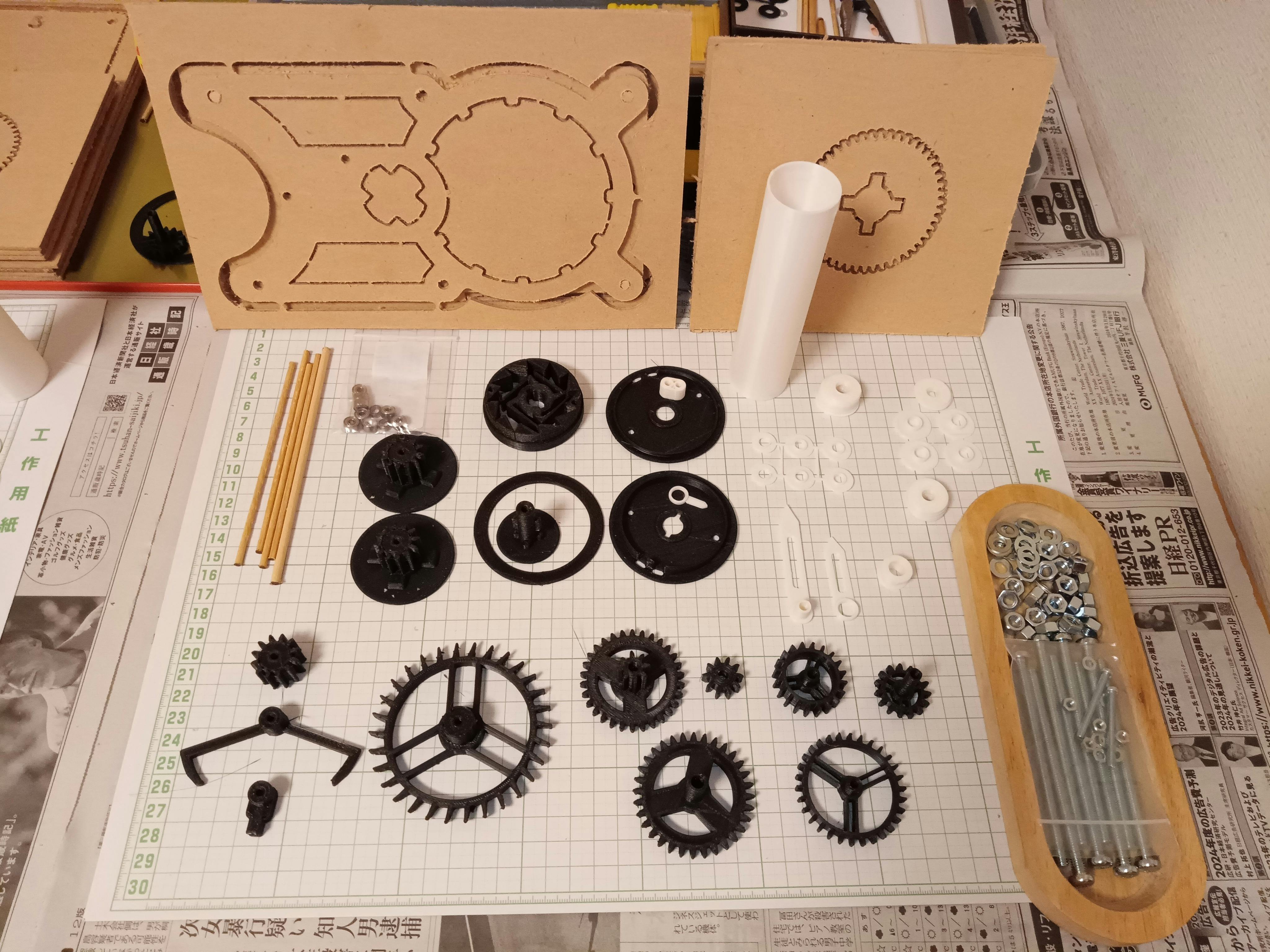 本日の画像は、現在作成中の『重錘式振り子時計』の全部品一覧です。改めて数えてみると部品は大小合わせて総計150個以上。部品毎に手入れをして、しっかり準備のうえお渡しします。