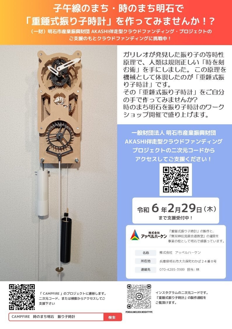 ご支援ご協力ありがとうございます。2月1日木曜日、一般財団法人明石市産業振興財団のライブ配信に出演させて頂きました。今回のプロジェクトの概要、重錘式振り子時計と作製講座の説明などを15分ほどにまとめて配信して頂きました。下記のURLから明石市産業振興財団のページに移動し、facebookの該当の動画が視聴頂けます↓↓↓https://www.facebook.com/akashi.sangyo/videos/712085701034991/?mibextid=rS40aB7S9Ucbxw6v是非、ご覧ください!※動画の始まりに右側でモタついております。申し訳ございません…。今日も含めて、募集終了まで4週間28日となりました。一人でも多くの方に「重錘式振り子時計」を楽しんで頂けるよう頑張って参ります。今後とも応援よろしくお願い申し上げます。