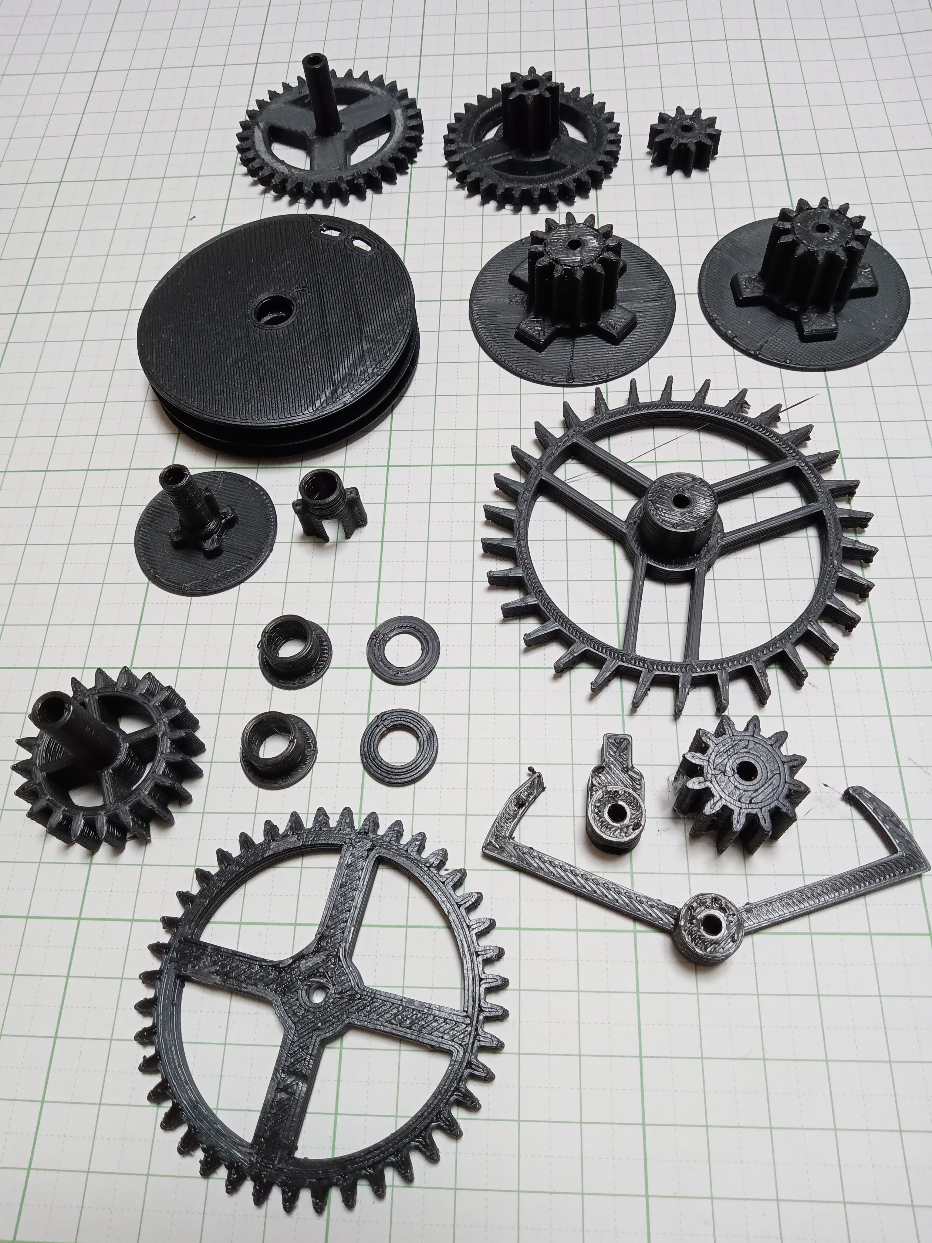 ご支援ご協力ありがとうございます!全歯車群の写真です。1枚にまとめるとそれなりです。3Dプリンターは寒いと材料が反ったり機械の中で固まったりと、メンテナンスが大変です。その面倒くさいところも、部品から作る手順も、本人にとっては楽しいのですが。今日はメンテナンスの1日でした。今後とも応援よろしくお願い申し上げます。