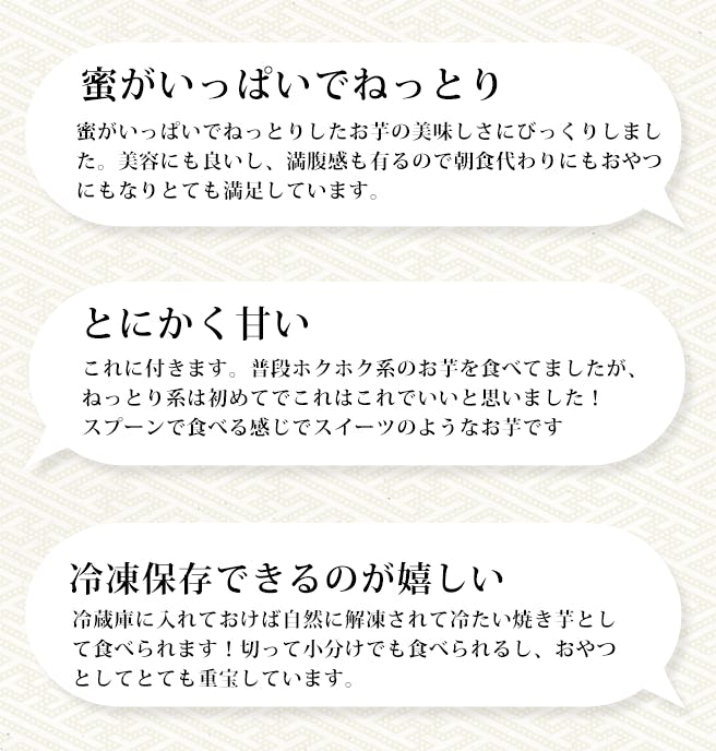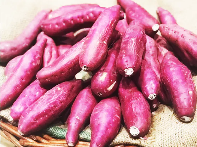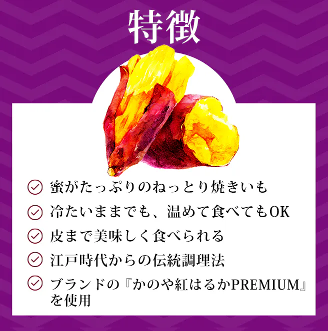 紅はるかは、さつまいもより「はるかに美味しい」という意味合いから誕生したさつまいもの一種です。その中でもかのや紅はるかPREMIUMを収穫後、低温多湿の(温度13℃~14℃、湿度90%以上)で長期間貯蔵した熟成さつまいもを使用しています。