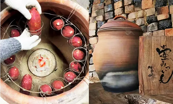 唐津焼大壺(炭焼)からの遠赤外線エネルギーと輻射熱エネルギーにより、一本一本手作業で丁寧に焼き上げるので焼ムラが無く、さつまいも本来のショ糖と糖類の中で最も美味しい天然甘み成分「麦芽糖」の滋味と美味しさを引き出します。大壺本焼きの工程に「麦芽糖」の生成の工程と大壺仕上げ焼きの工程で粘りが強く甘みも強い「壺みついも」が出来上がります。