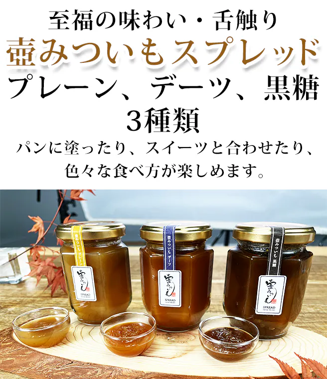 【壺みついもスプレッドプレーン】壺みついも×てんさい糖(北海道産) 一番人気のプレーン。甘さの中にしっかりと壺みついもが感じられます。トーストやパンケーキ、アイスクリームとの相性が抜群です! 【壺みついもスプレッドデーツ】壺みついも×デーツ(イラン産) 優しい甘さのデーツ。クリームチーズを合わせたサラダやホイップクリームと合わせてお菓子のトッピングにもおすすめです! 【壺みついもスプレッド黒糖】壺みついも×黒糖(奄美大島産) コクのある黒糖。深い味わいが魅力です。ホットミルクと合わせると寒い日にはピッタリの優しいドリンクです!