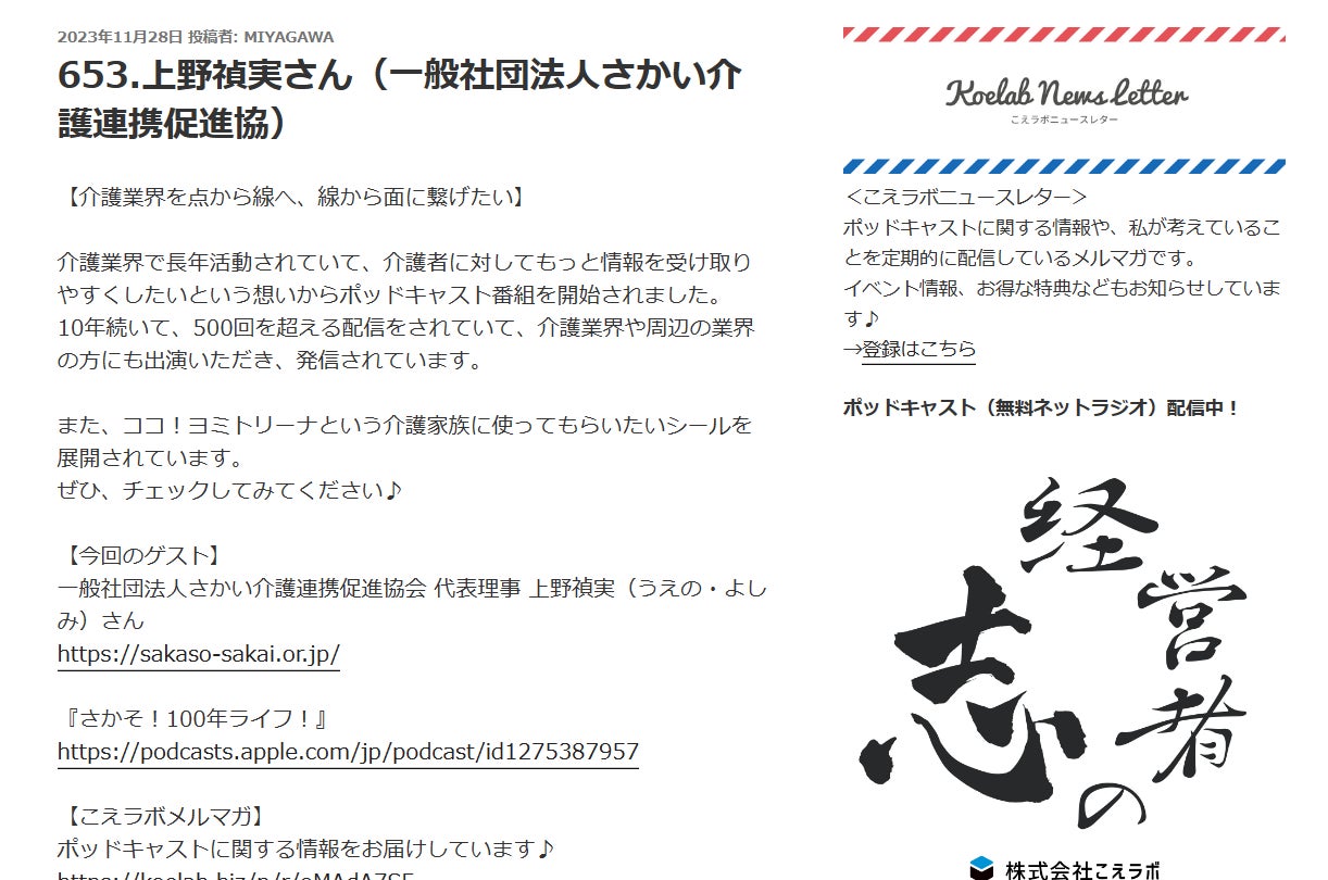 皆様、あたたかい支援本当にありがとうございます!先日「経営者の志」(株式会社こえラボ)という番組に出演させていただきました!どのような志で会社を経営し、社会に対して貢献するか、経営者の想いをインタビューする660回を超える長寿番組です。一般社団法人さかい介護連携促進協会の活動内容を中心に「ココ!ヨミトリーナ」の話も聴いてくださったので、是非ともお聴きください!https://spirit.koelab.net/653/緊張と興奮で声がうわずって、鼻息荒いですがw「経営者の志」はとても勉強になる番組です!ゲスト出演された660の経営者の方々で凄いネットワークになっていることでしょう。