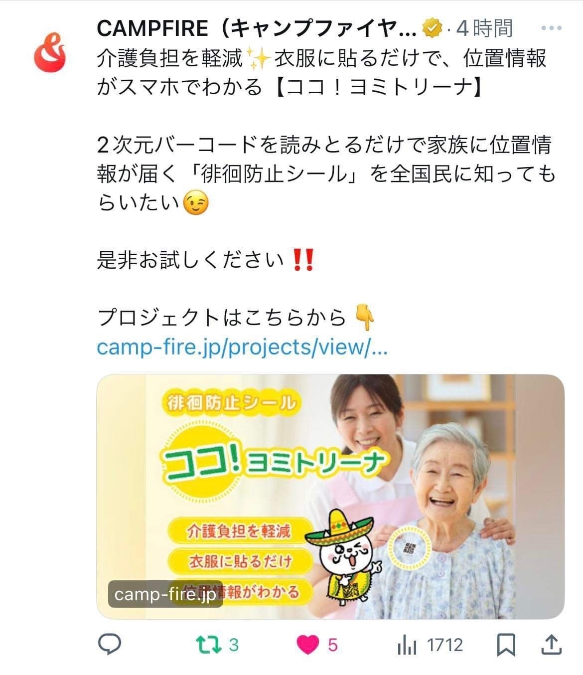 ご支援&応援いただきありがとうございます!先日、堺市のケアプランセンターの管理者様から「ココ!ヨミトリーナ」を、まとまった枚数ほしいとの連絡をいただきました。複数のケアマネジャーがいて、徘徊で悩んでいる利用者様にこれを使ってもらって、二次元バーコードを読み取った時の連絡先をケアプランセンター(事業所にして)共有して使うとのことです!個人情報の観点から、そういった使い方もありですね!貴重な提案ありがとうございました!