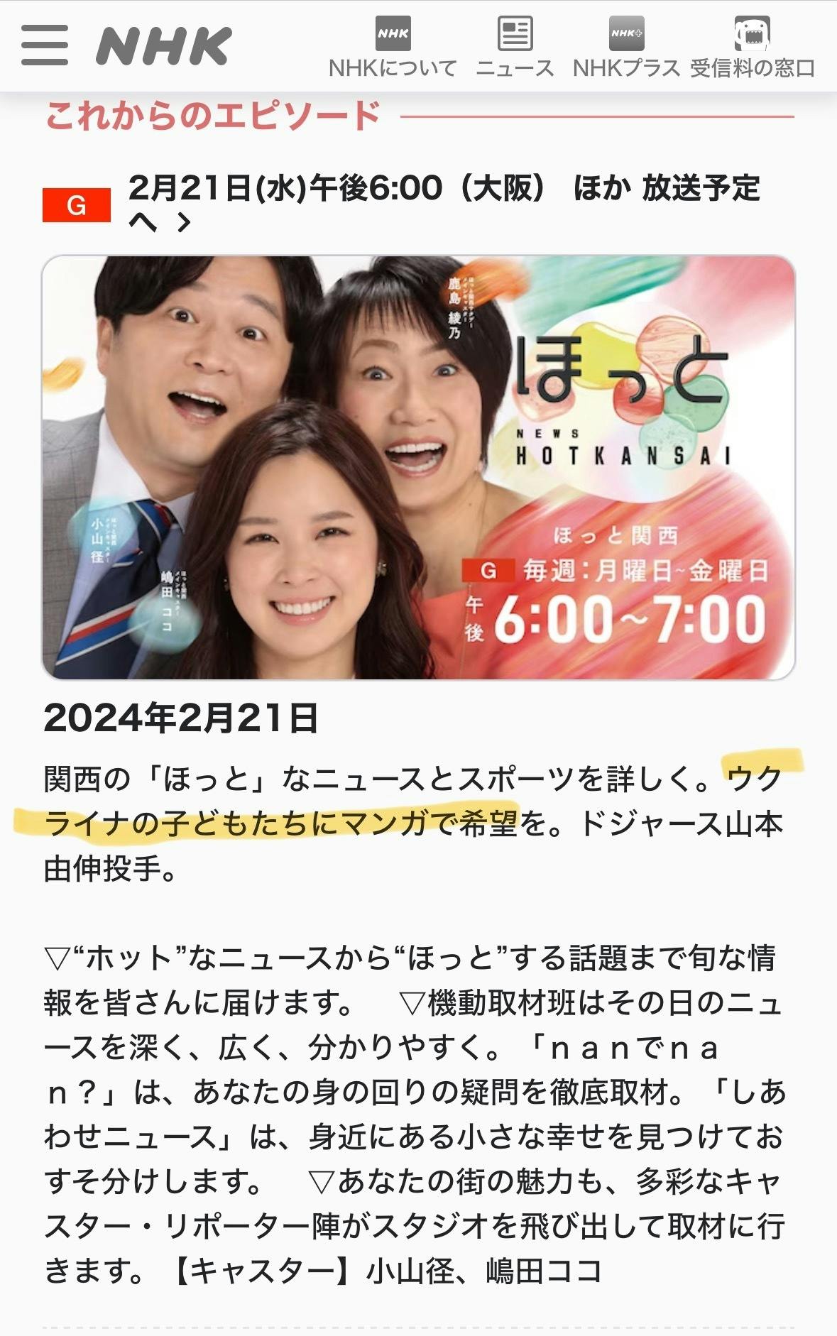 私たちの、ウクライナの子ども支援プロジェクト(https://camp-fire.jp/projects/view/714083)が、NHKの関西圏のニュース番組「ほっと関西」18:00-18:30のどこかの時間にて取り上げられます!