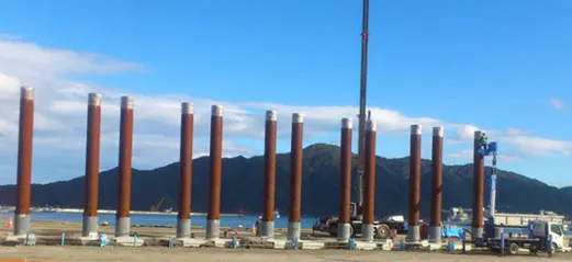 (東北津波被災地に建設途中の巨大堤防支柱群)